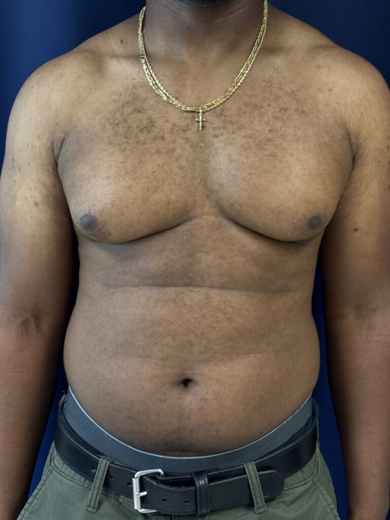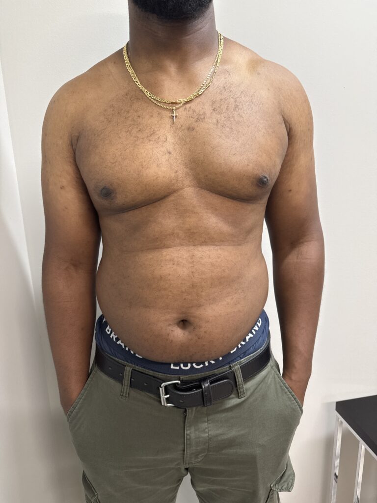 we performed awake gynecomastia surgery, and he came in for a follow up at the six-week mark. here’s his front view at the six-week mark. Already, he feels much more confident and happy. Note the smoothness.