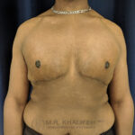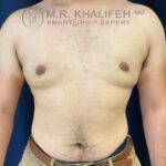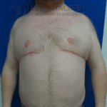 This gentleman wanted a reduction in gynecomastia breast size with the least scarring possible. Here we remove the gland and rely on skin retraction alone, avoiding the chest horizontal scar. The downside is residual skin laxity which manifests as excess fullness in the lower part of the chest. Still, the improvement with acceptable scarring results in a much more comfortable appearance for patients who elect this approach.